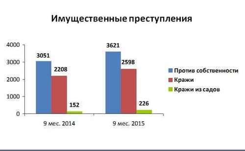 С марта продолжается рост количества краж из садовых домиков. С целью пресечения в июле-сентябре на территории города было проведено оперативно-профилактического мероприятия «Сады», что позволило сократить рост краж. Возросло общее число фактов поджогов, в том числе транспортных средств.