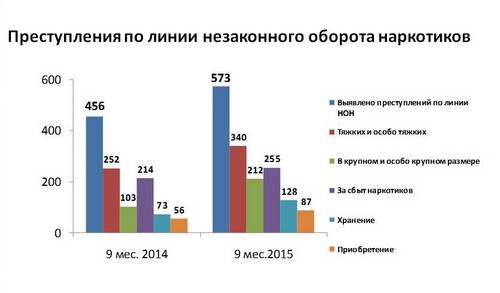 Сотрудниками полиции выявлено 68% всех противоправных деяний, связанных с наркотиками. В их числе 340 – тяжкие и особо тяжкие, 212 – в крупном и особо крупном размере, 255 связаны со сбытом, 128 – с хранением, 87 фактов, связанных с приобретением. За совершение наркопреступлений, к уголовной ответственности привлечено 136 человек. Выявлено 6 наркопреступлений, совершенных в составе группы лиц. Прекращена деятельность 1 наркопритона. По административной практике по линии незаконного оборота наркотиков составлено 590 протоколов. С начала года сотрудниками ОВД на территории города из незаконного оборота изъято более 8 кг наркотических средств.