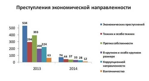 Всеми правоохранительными органами выявлено 96 экономических преступлений. Среди них 28 преступлений коррупционной направленности (11 - в крупном или особо крупном размере, 15 должностных преступлений, в том числе по факту взяточничества - 12 преступлений). Выявлено 6 лиц, совершивших коррупционные преступления, они привлечены к уголовной ответственности. Окончено и направлено в суд 53 уголовных дела экономической направленности, по которым привлечено к ответственности 32 человека.