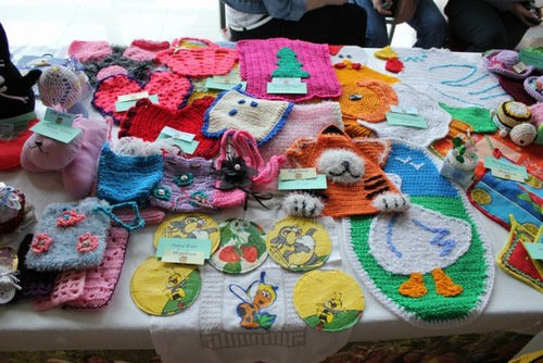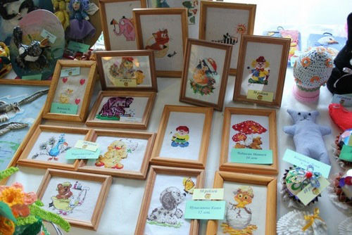 заботливо связанные крючком, целые наборы подушек, глиняные фигурки и статуэтки, вышитые картины, расписанные на ткани затейливые сюжеты, рукодельные куклы, игрушки и многое другое. В среднем стоимость поделок не превышала 50 рублей, и в конечном итоге за два дня ребята собрали сумму в 9500 руб.