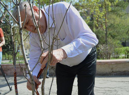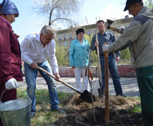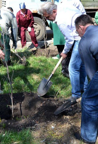 Сегодня в сквере на улице Чапаева он вместе с сотрудниками Объединения защиты прав потребителей и жителями района высадил 15 ясеней. На каждое деревце повязали Георгиевскую ленту.