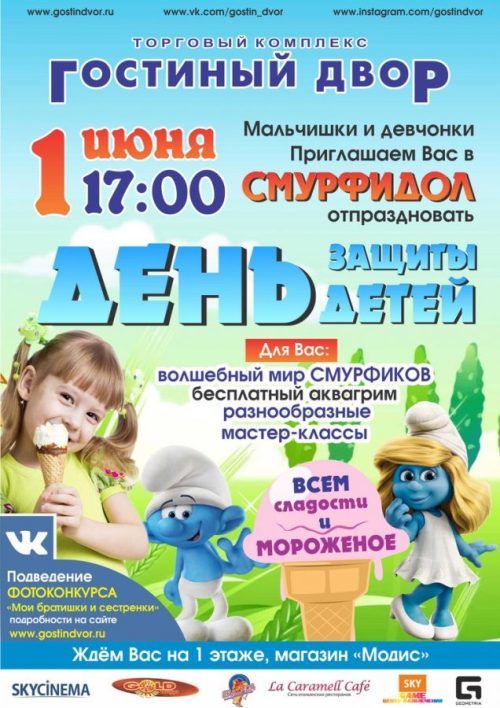 Через час, в 17.00, начнётся праздничная программа в ТРК «Гостиный двор». Гостей приглашают в страну «Смурфидол». Сказочные персонажи проведут конкурсы и викторины. Девочкам заплетут косички. Ребятам предлагают поучаствовать в мастер-классах, порисовать цветным песком, сфотографироваться в фотозоне. Они увидят выступление танцевального коллектива DancePeople. Мастера сделают бесплатный аквагрим. Детям будут раздавать сладости, мороженое и воздушные шары.