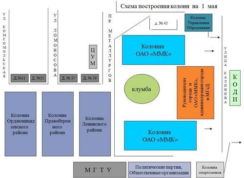 В шествии 1 мая примут участие руководители города, работники ОАО «ММК» и других предприятий, студенты, учащиеся, представители различные организаций и учреждений, а также политических партий и профсоюзных объединений.