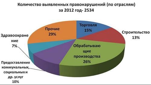 По информации начальника отдела Андрея Петрова, в прошлом году инспекторы провели 536 различных проверок соблюдения трудового законодательства РФ. Обследовать удалось 2,1% предприятий и организаций города и близлежащих районов. Выявлено 2534 нарушений трудового законодательства. В обрабатывающих производствах – 26,3%, в торговле – 15%, в строительстве –13%, при предоставлении коммунальных и социальный услуг – 10,1%, в здравоохранении – 7%, в сельском и лесном хозяйстве – 6,3%, в образовании – 4,3%.