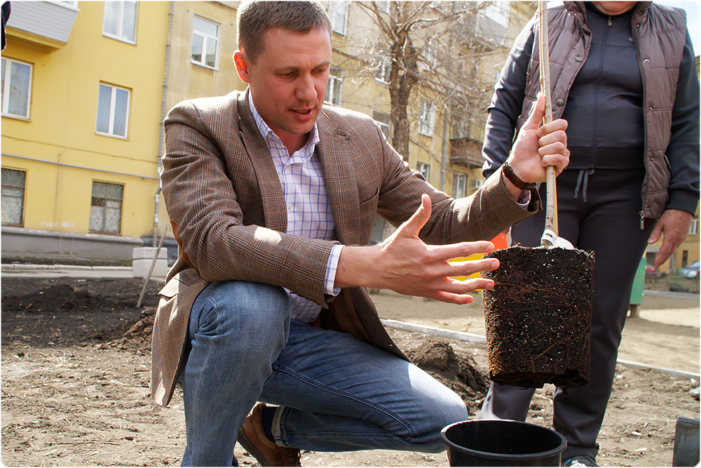 Алексей Степанов, кажется, знает все о своих зелёных питомцах. Он и показал мастер-класс по высадке первого деревца. «Корневая система сформирована прямо в горшке, - объясняет он собравшимся жителям. – Приживаемость у деревьев практически 100-процентная. Они должны хорошо расти в городской среде. Только поливать не забывайте раз в пять дней… Потом крону дерева можно сформировать: или ввысь пустить в один ствол, или боковые ветви оставить и сделать его пышным».