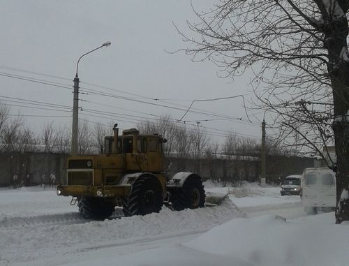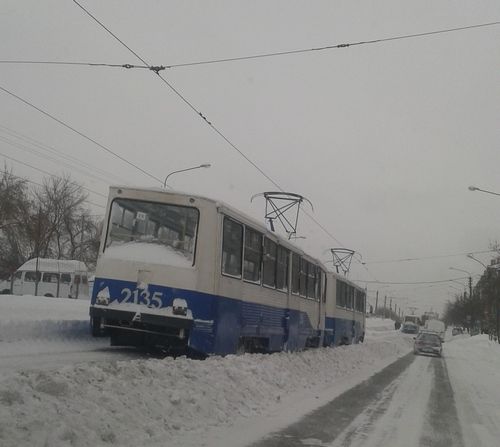 Из-за сильных снежных заносов в начале дня было затруднено движение трамваев.