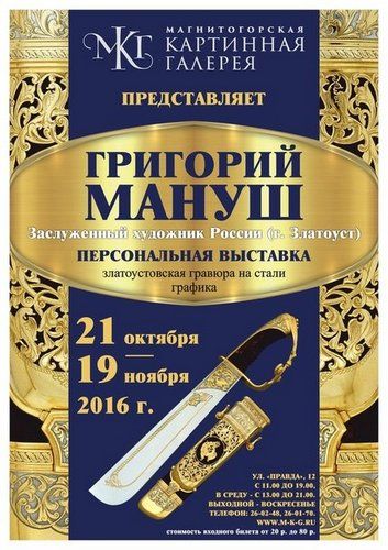 В ближайшую пятницу состоится открытие персональной художественной выставки Григория Ивановича Мануша – художника-графика, прикладника, заслуженного художника РФ, председателя Златоустовского отделения Союза художников России. Он является одним из основателей мастерских декоративно-прикладного искусства «Лик» в Златоусте.