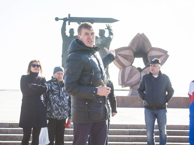 Напутствуя участников пробега, Александр Морозов, обратил внимание на то, что старт глубоко символичен. «Вы отправляетесь от монумента, являющегося частью триптиха скульптора Вучетича. В Магнитке рабочий вручает меч Победы солдату. В Волгограде этот меч поднят над головой Родины-матери, призывающей бороться с врагом. А в Берлинском Трептов-парке победивший русский солдат опустил свой меч и взял на руки спасённую немецкую девочку», - сказал он и рассказал историю создания и особенности всех монументов.