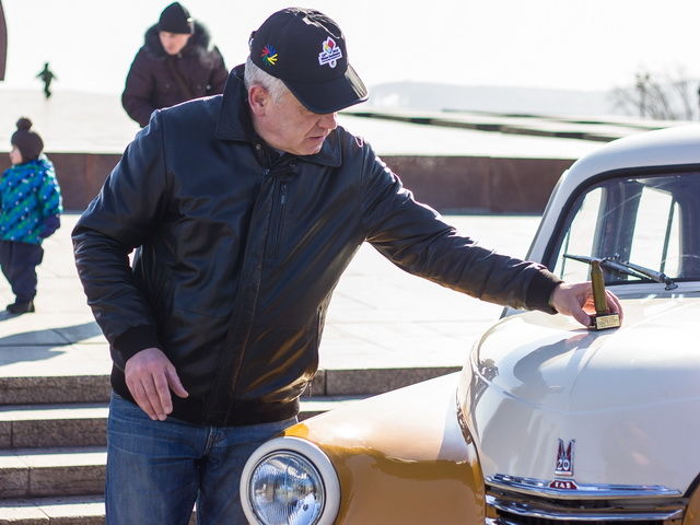 Благодаря магнитогорцев за тёплые пожелания и напутствия, руководитель автопробега вручил председателю горсобрания Александру Морозову гильзу, наполненную землёй из двенадцати городов-героев, по которым прошёл автопробег ретроавтомобилей в прошлом году. Это города Белоруссии, Украины и России. Теперь эта гильза станет почётным экспонатом нашего краеведческого музея.