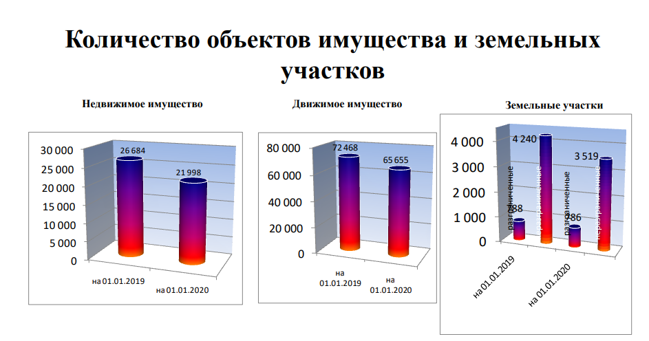 В реестре муниципального имущества на 1 января 2020 года числятся: 22 тыс. объектов недвижимого имущества стоимостью 22,5 млрд. руб.; 65,6 тыс. объектов движимого имущества стоимостью 5,2 миллиарда руб.; 786 земельных участков, общей площадью 1 170 га, кадастровой стоимостью 17 млрд. руб.