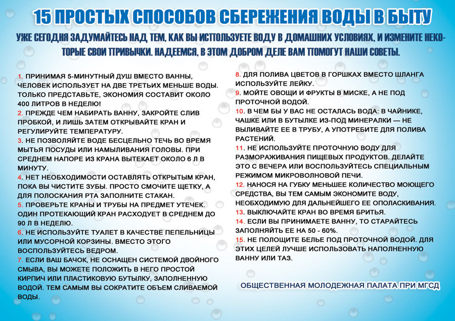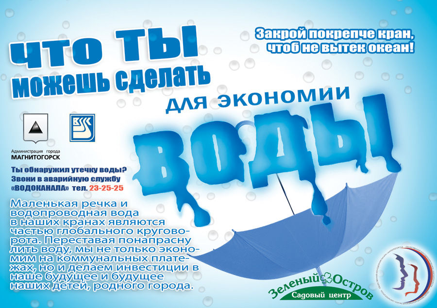 Молодежь собирается познакомить магнитогорцев с простыми способами сбережения драгоценного ресурса в быту, а именно, укажет на 15 способов экономии. Для этого разработаны специальные листовки. В них также есть телефон аварийной службы «Водоканала» - 23-25-25, по которому в любое время дня и ночи жители могут сообщить об обнаруженной утечке воды.