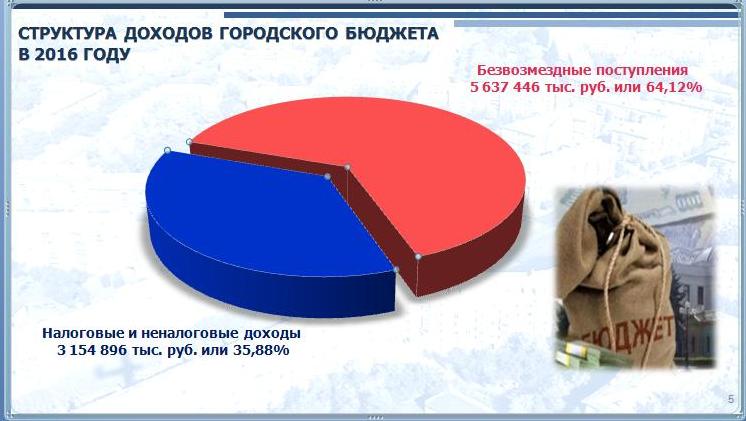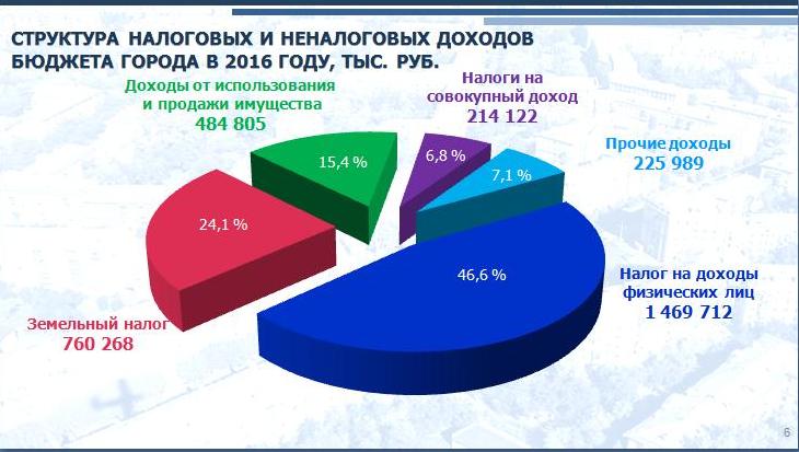 В основу расчетов, по словам заместителя главы города Юрия Емельянова, принят консервативный вариант прогноза социально-экономического развития города в 2016 году. Общий объем доходов утвержден в сумме 8,8 млрд. рублей. Из них поступления из вышестоящих бюджетов - 5,6 млрд. рублей, собственные налоговые и неналоговые доходы составляют 3,2 млрд. рублей.