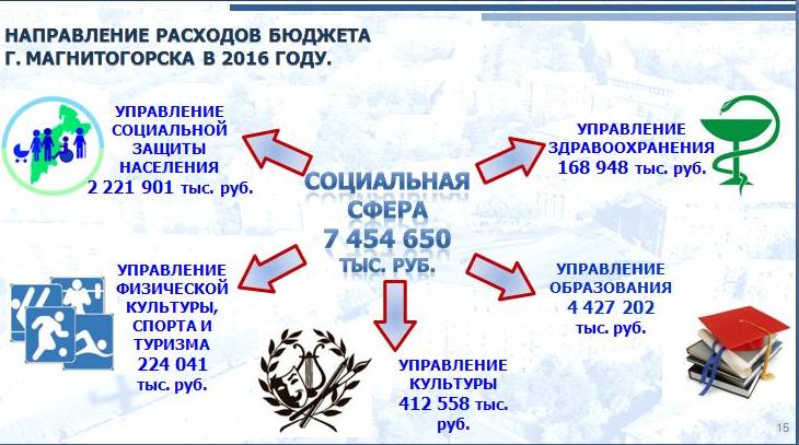 Объем расходов проекта бюджета города на 2016 году составляет 8,8 млрд. рублей. Главный финансовый документ Магнитогорска является социально ориентированным (86% расходов приходится на социальную сферу), и составлен по программному принципу (97,5% расходов отражают реализацию программ в разных сферах городской жизнедеятельности). Наибольшую долю в составе расходов занимают следующие муниципальные программы: «Развитие образования в городе Магнитогорске» (54,6% или 4,4 млрд. рублей) и «Социальное обслуживание и социальная поддержка жителей города Магнитогорска» (24,7 % или 2,2 млрд. рублей).