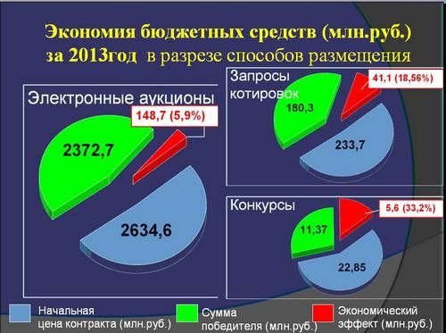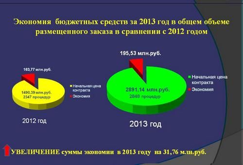 Проведено 2 848 торгов и запросов котировок на сумму 2 млрд. 891 тыс. рублей, что также превышает показатели 2012 года. Доля электронных аукционов составила подавляющее большинство от общего количества торгов.
