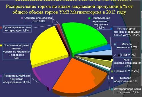 Наибольшую долю в проведённых процедурах в прошедшем году занимали строительство, благоустройство территории, ремонтные работы – 27%; приобретение имущества (жилых квартир) – 24,5%; поставка продуктов питания, услуги по хранению, перевозке в бюджетных учреждениях – 24%; лекарства и медоборудование – 11,5%; компьютерная техника и информационные услуги – 2,7%.