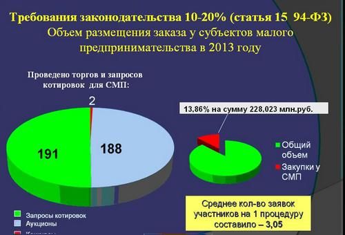 У субъектов малого предпринимательства, как того требует закон, размещено заказов на сумму 228 млн. рублей, что составляет почти 14% от общего объёма поставок товаров, выполнения работ и оказания услуг. Напомним, что по закону предусмотрено 10-20%.