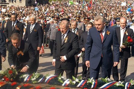 На торжественном митинге у монумента «Тыл-фронту» звучали поздравления от главы города Евгения Тефтелева, представителя ОАО «ММК» Олега Федонина, председателя горсобрания Александра Морозова, президента МаГУ Валентина Романова.Оружейные залпы воинского салюта, музыка духового оркестра, хор и глубоко трогающие душу песни