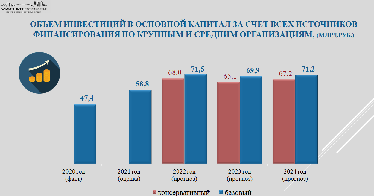 Деятельность ПАО «ММК», его планы по реконструкции и развитию позволяют городу с уверенностью смотреть в будущее. Объем инвестиций по итогам 2021 года оценивается на уровне 58,8 млрд. рублей. При этом объем вложений градообразующего предприятия составляет 80 % в общем объеме инвестиций. Согласно прогнозу и с учётом намерений предприятий инвестиции в 2022 году составят от 68 до 71,5 млрд. рублей по консервативному и базовому вариантам соответственно.