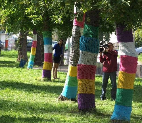 Вчера вечером в парке Металлургов народу было гораздо больше, чем в обычные будние дни. Внимание горожан привлекли деревья, одетые в яркие вязаные одежды.