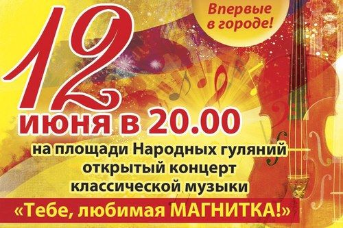 На площади Народных гуляний 12 июня в 20.00 состоится первый открытый концерт классической музыки «Тебе, любимая Магнитка!», посвященный празднованию 85-летия Магнитогорска.