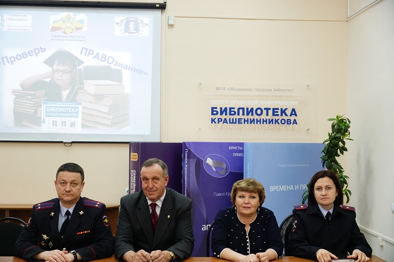 26 апреля в Магнитогорске стартовала Всероссийская акция Общественного совета при МВД России «Проверь ПРАВОзнание». В Центре правовой информации «Библиотека Крашенинникова» собрались ученики 8-11 классов образовательных учреждений, сотрудники Управления МВД России по городу Магнитогорску, представители Общественного совета, Управления образования Администрации города и местного отделения «Ассоциации юристов России».